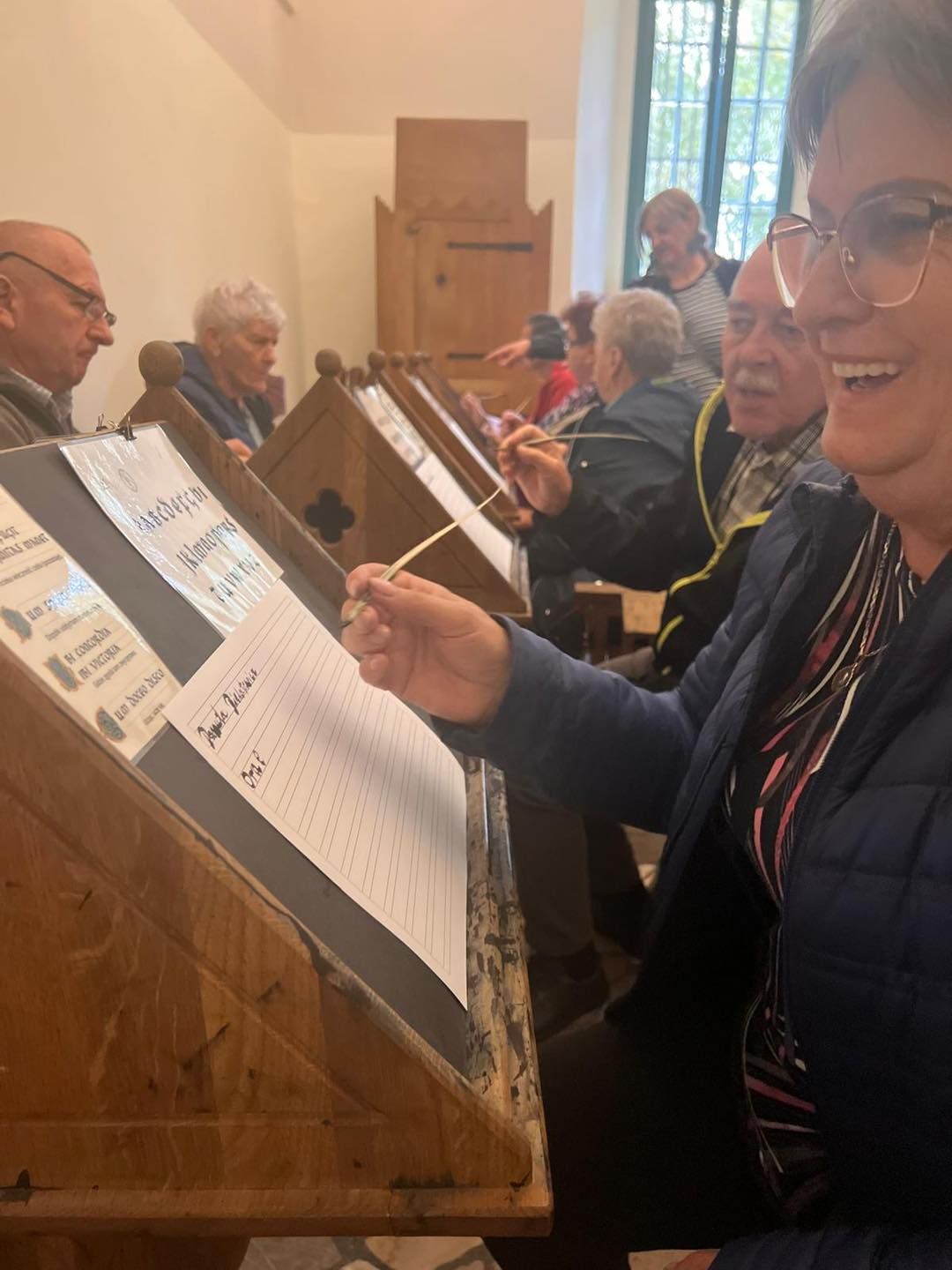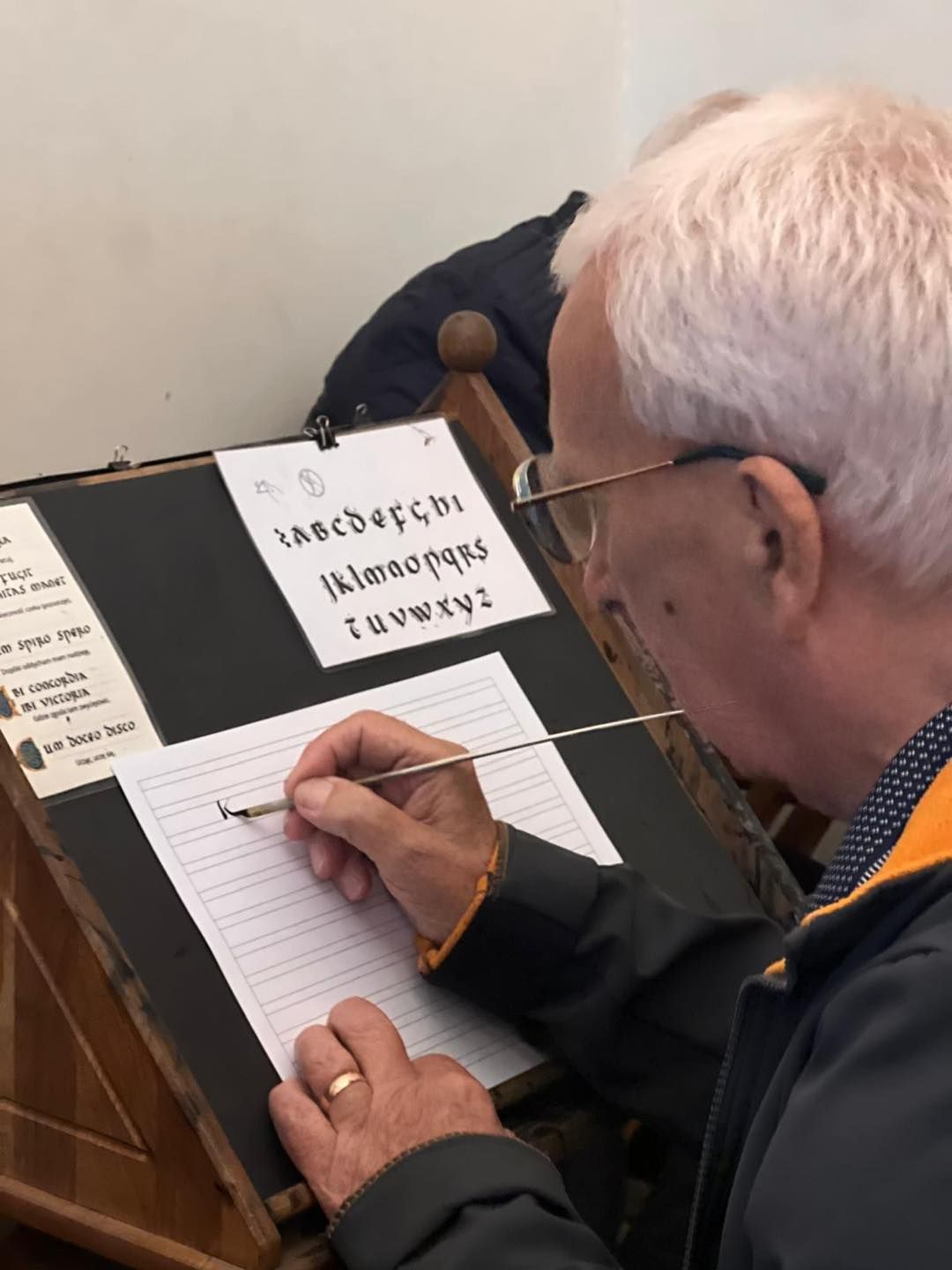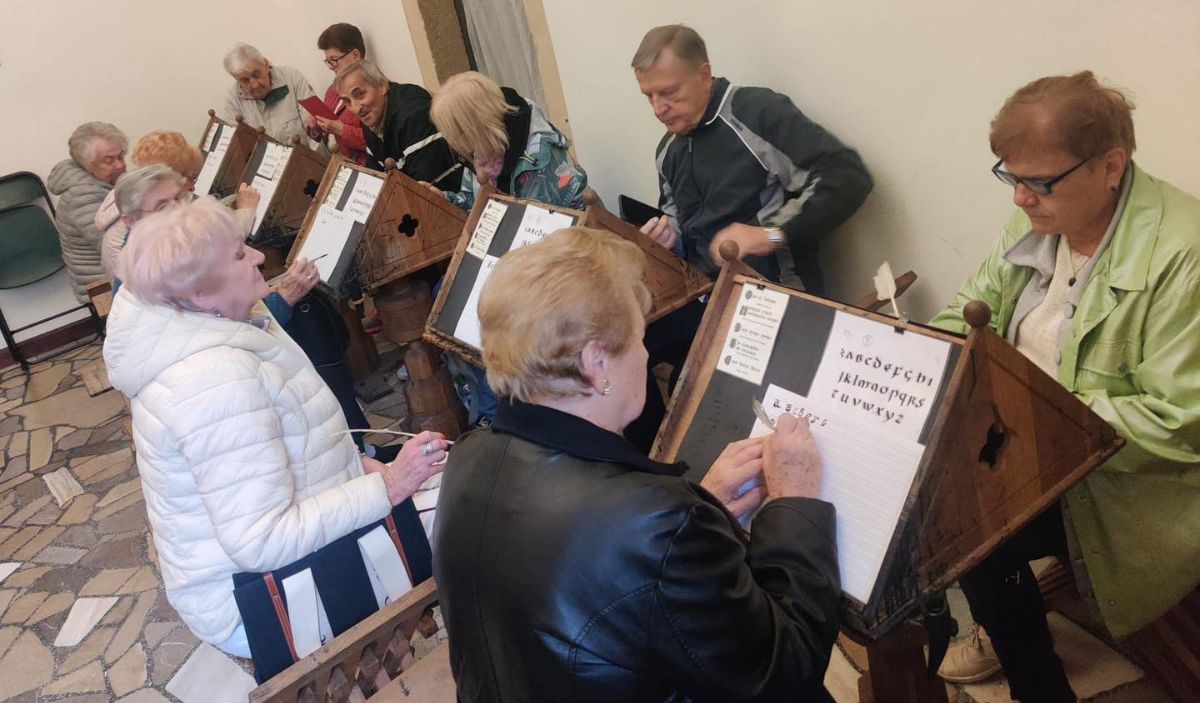 Następnie seniorzy zwiedzili tynieckie muzeum, w którym prezentowane są zabytki związane z przeszłością klasztoru, a wśród nich obiekty archeologiczne, romańskie detale architektoniczne, rękopisy, druki i przedmioty liturgiczne. Po tej aktywności dębickich turystów czekała wyjątkowa atrakcja – warsztaty kaligrafii. Seniorzy próbowali swoich sił w sztuce pięknego pisania i okazało się, że to świetna zabawa (choć wcale nie taka łatwa ).