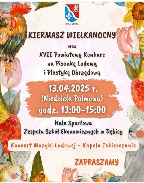 Serdecznie zapraszamy na Kiermasz Wielkanocny, który odbędzie się w najbliższą niedzielę 13.04.2025r. w Hali Sportowej Zespołu Szkół Ekonomicznych w Dębicy. Kiermasz połączony będzie z XVII Powiatowym Konkursem na Pisankę Ludową i Plastykę Obrzędową.