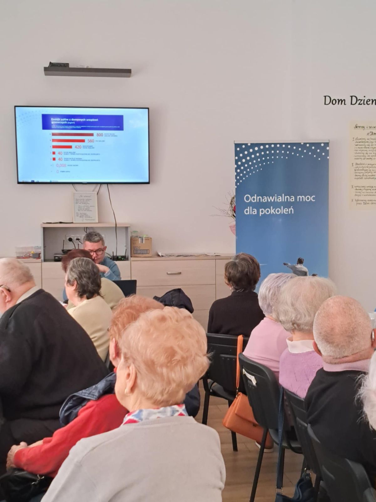 Seniorzy siedzą przy stolikach zwróceni w stronę wyświetlanej prezentacji omawianej przez pracownika Wydziału Ochrony Środowiska