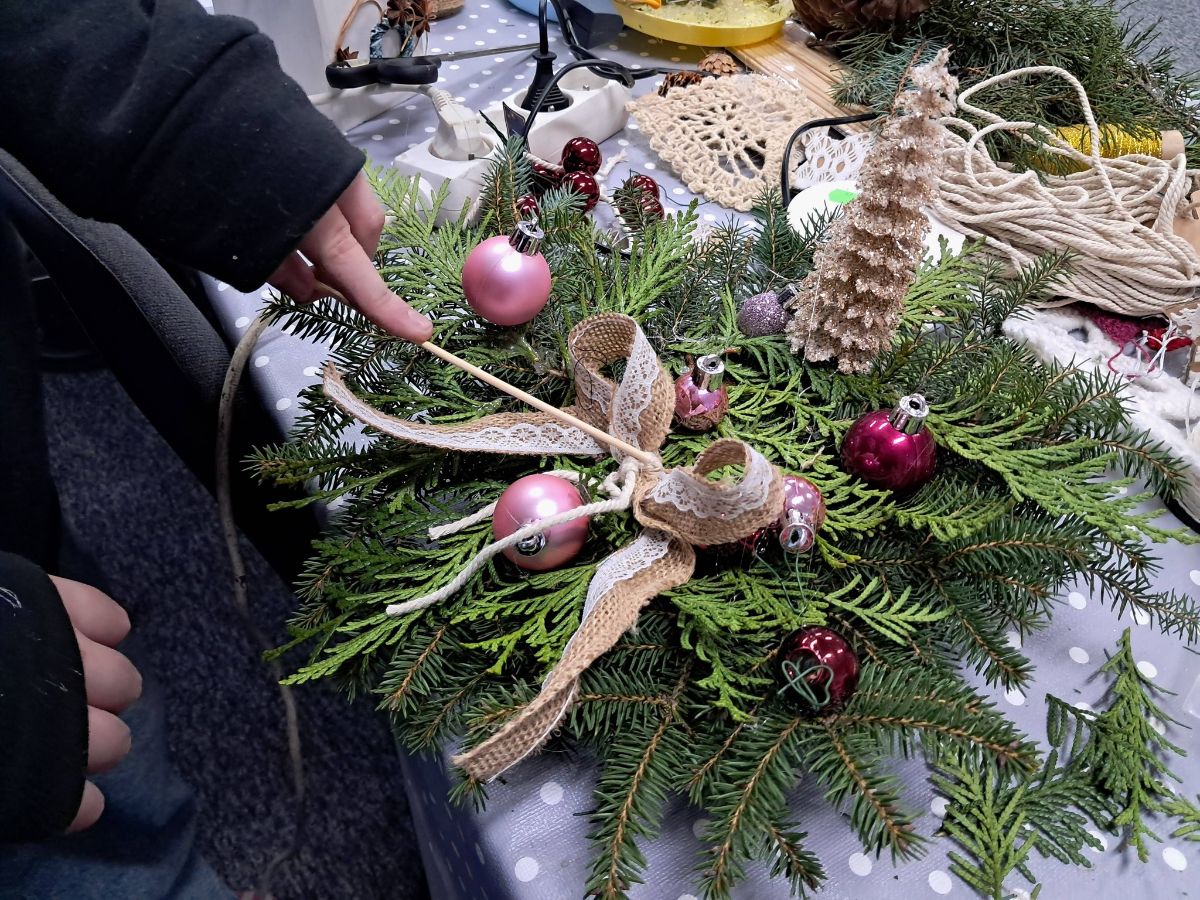 Na zdjęciach ozdoby świąteczne przygotowywane przez dzieci i seniorów na stoiska do Miasteczka Bożonarodzeniowego