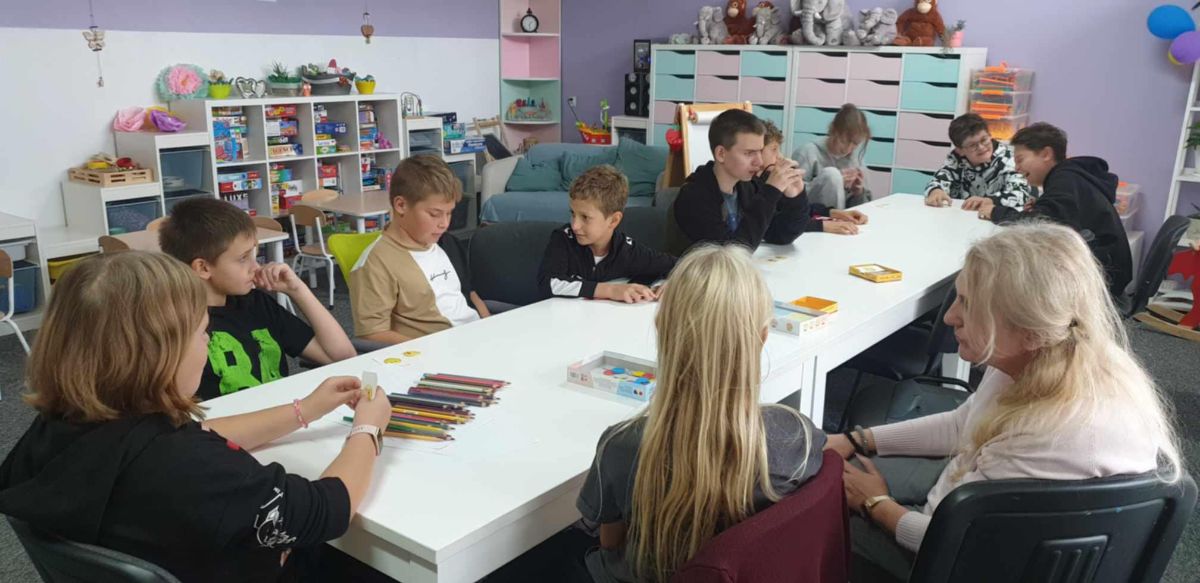 dzieci uczęszczające na świetlice podczas warsztatów grupowych, zajęcia przy stolikach oraz w kręgu na wykładzinie